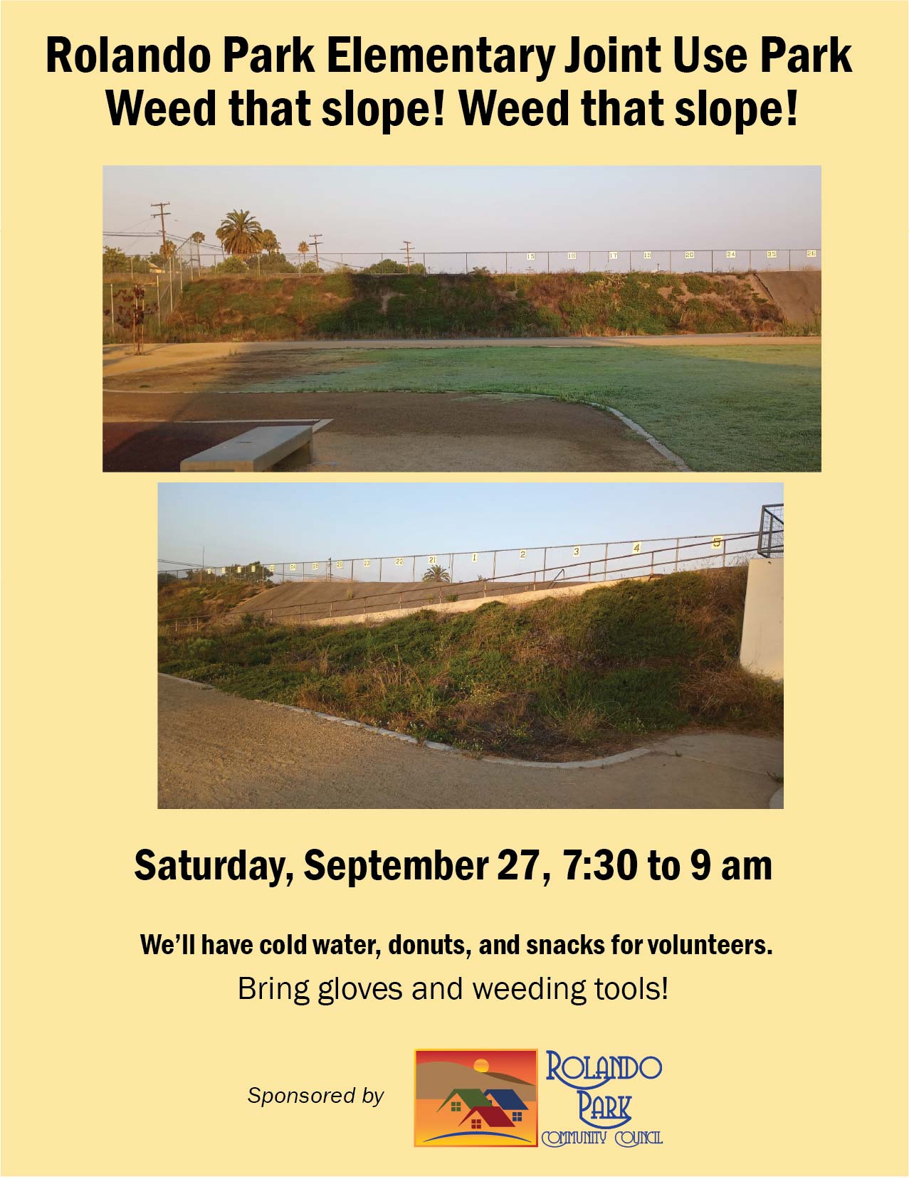 - Saturday, September 27, 7:30-9 am, Rolando Park Elementary Joint Use Park: Weeding the slope