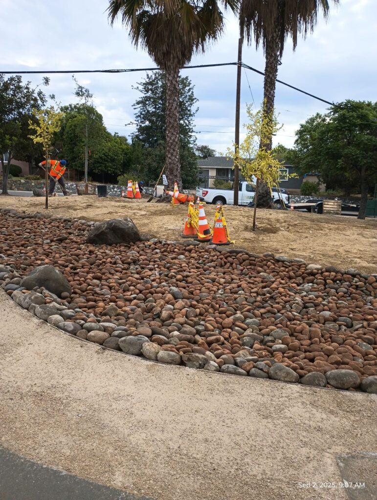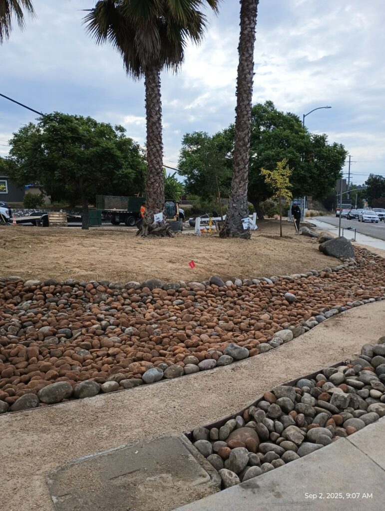 All of the existing cobblestones and boulders will be reused with some strategic placement in addition to new river rocks for the swales.