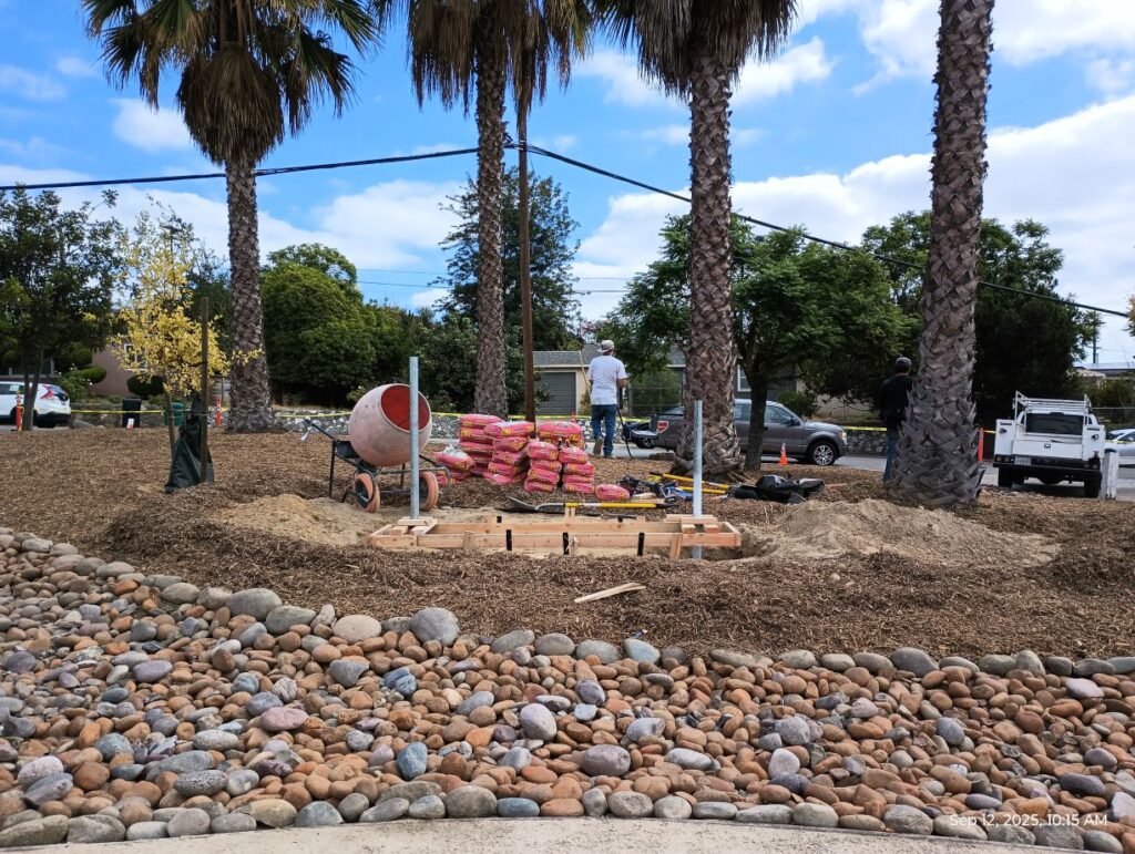 Not nearly as exciting as the landscaping, but a productive day. Holes were dug, forms for the concrete base were built and inspected and approved by the city, and concrete poured for the sign base that will cure over the weekend. Next week, the sign structure will be delivered and installed and the stucco and stone veneer work will begin.