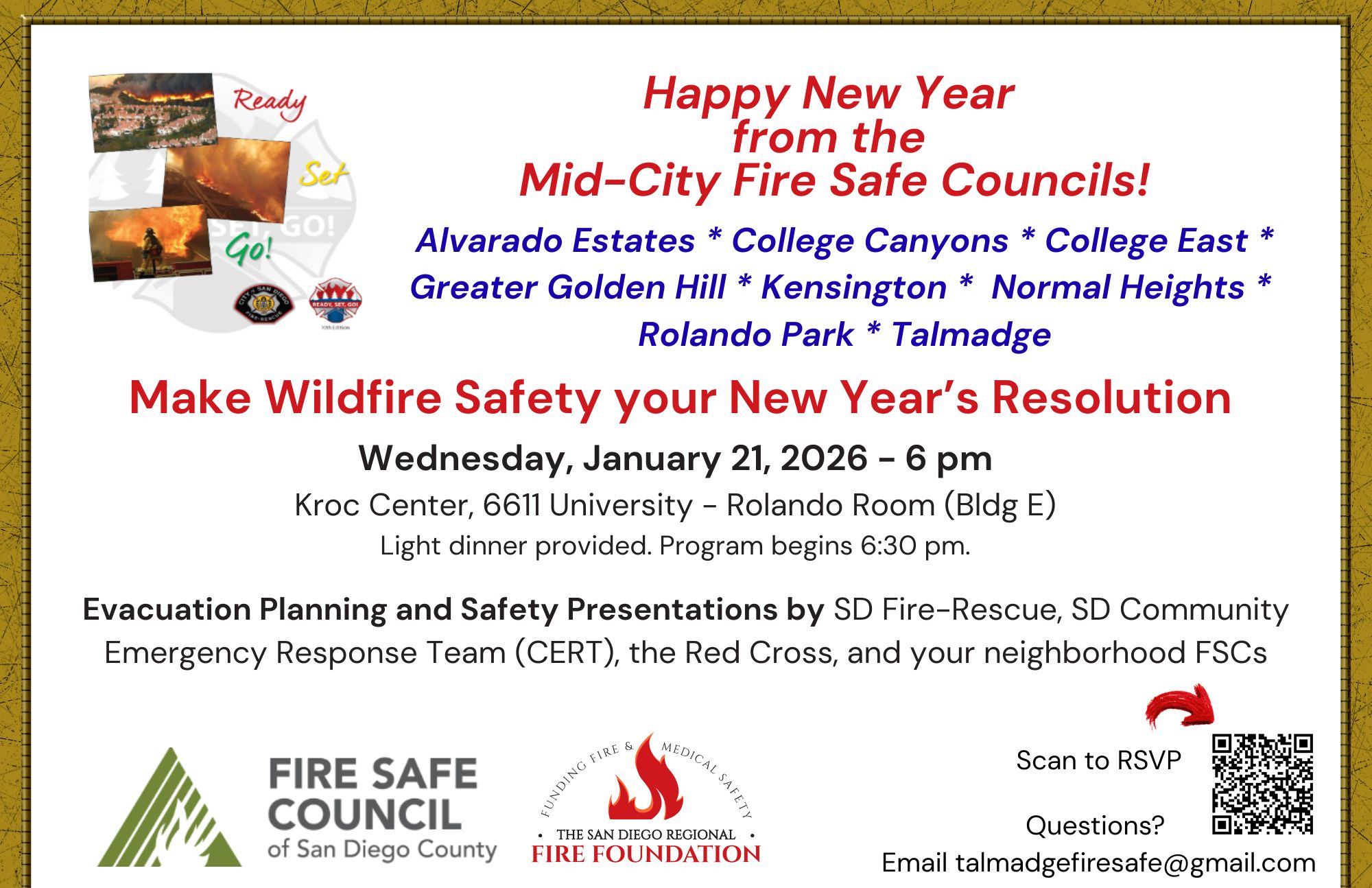 On January 21, 2026 at 6pm at the Kroc Center, the Rolando Park Fire Safe Council is co-sponsoring a Wildfire Safety presentation with 7 other Mid-City Fire Safe Councils.